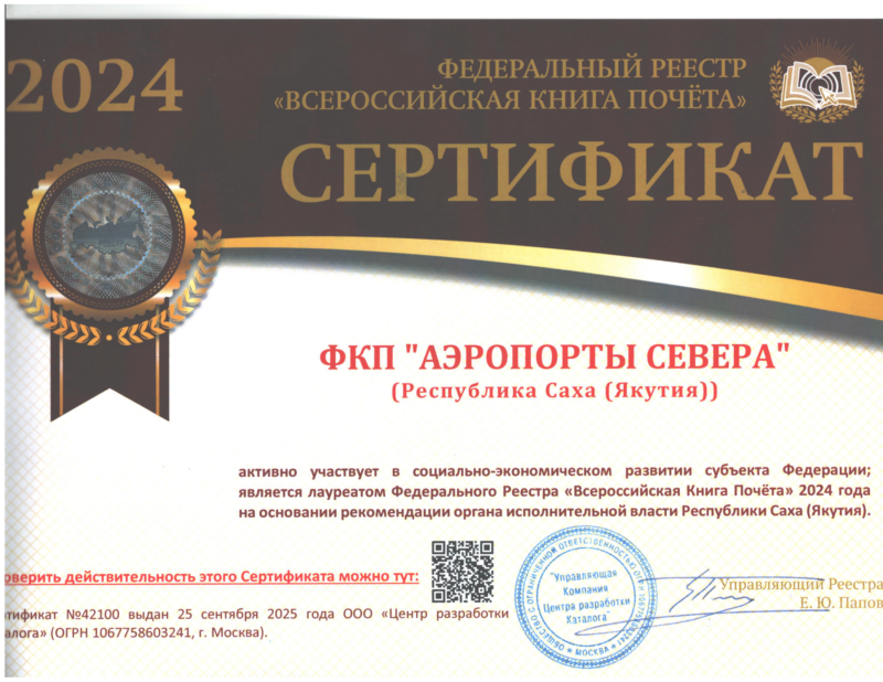 По итогам 2024 года ФКП «Аэропорты Севера» включено в Федеральный Реестр «Всероссийская книга почета».